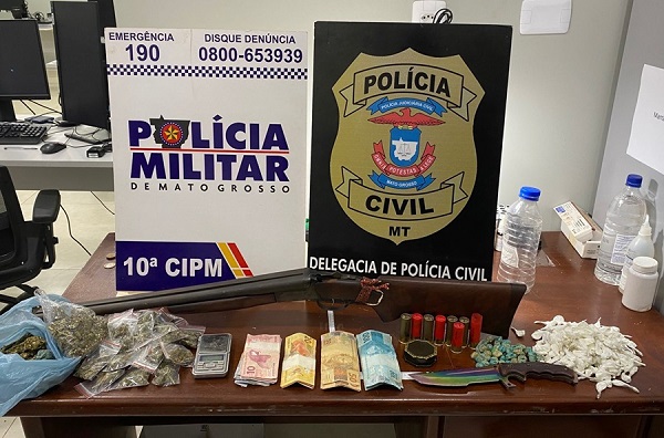Uma ação conjunta realizada na segunda-feira, 11 de novembro, entre a Polícia Judiciária Civil e a Polícia Militar, resultou na prisão de quatro pessoas, entre 18, 20, 29 e 47 anos de idade, e na apreensão de drogas e uma arma de fogo, como parte de uma operação para combater o tráfico de drogas e desmantelar uma organização criminosa, no bairro Jardim Paraná em Aripuanã-MT.